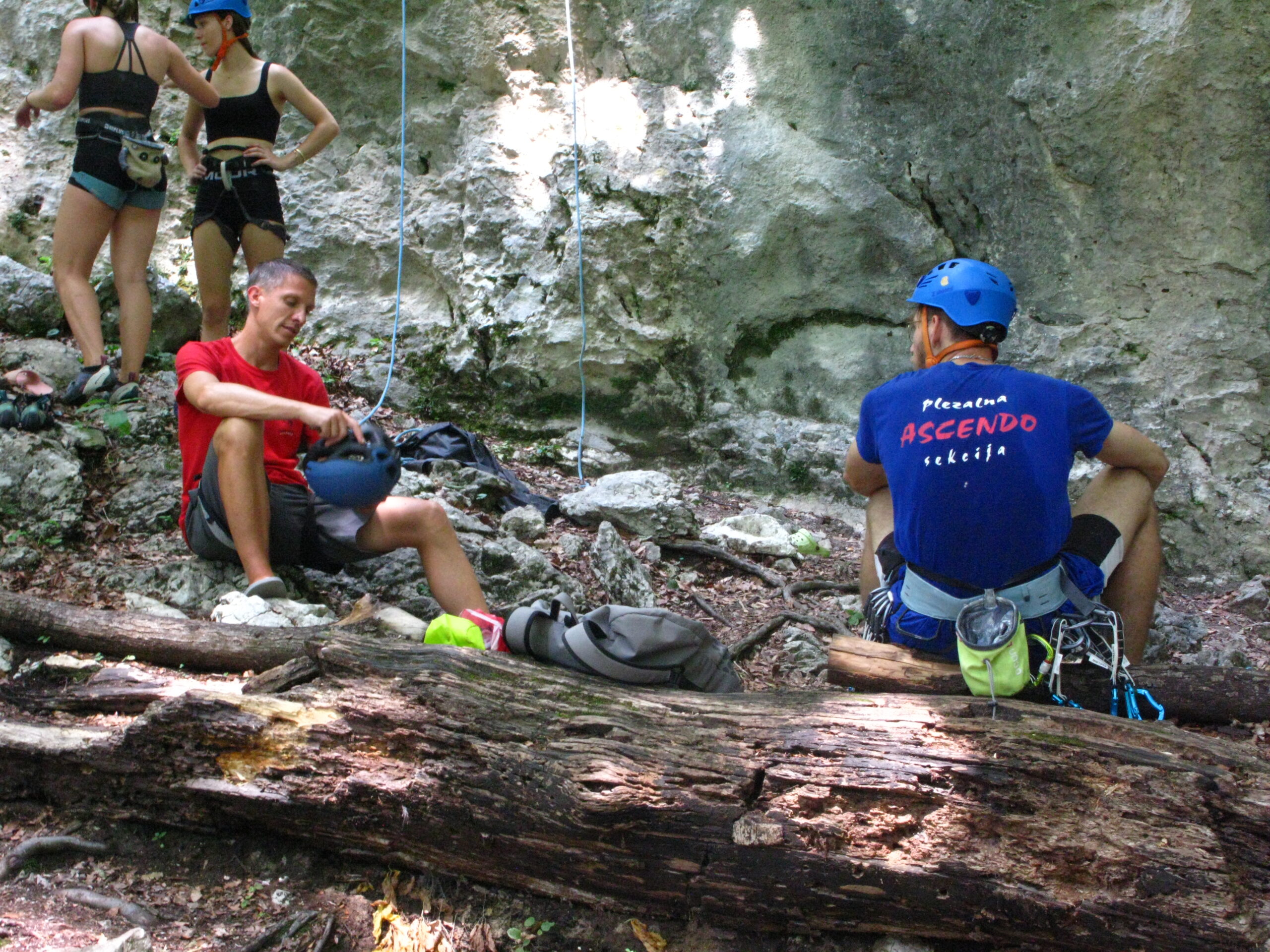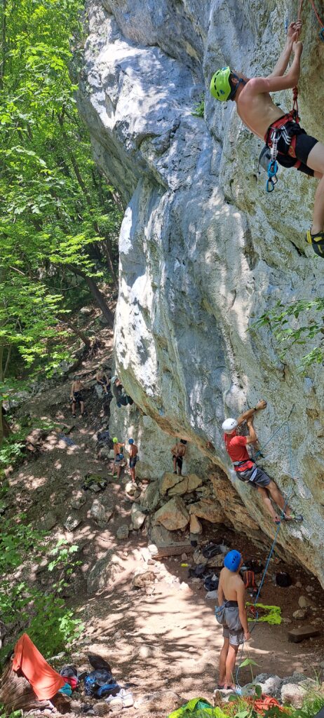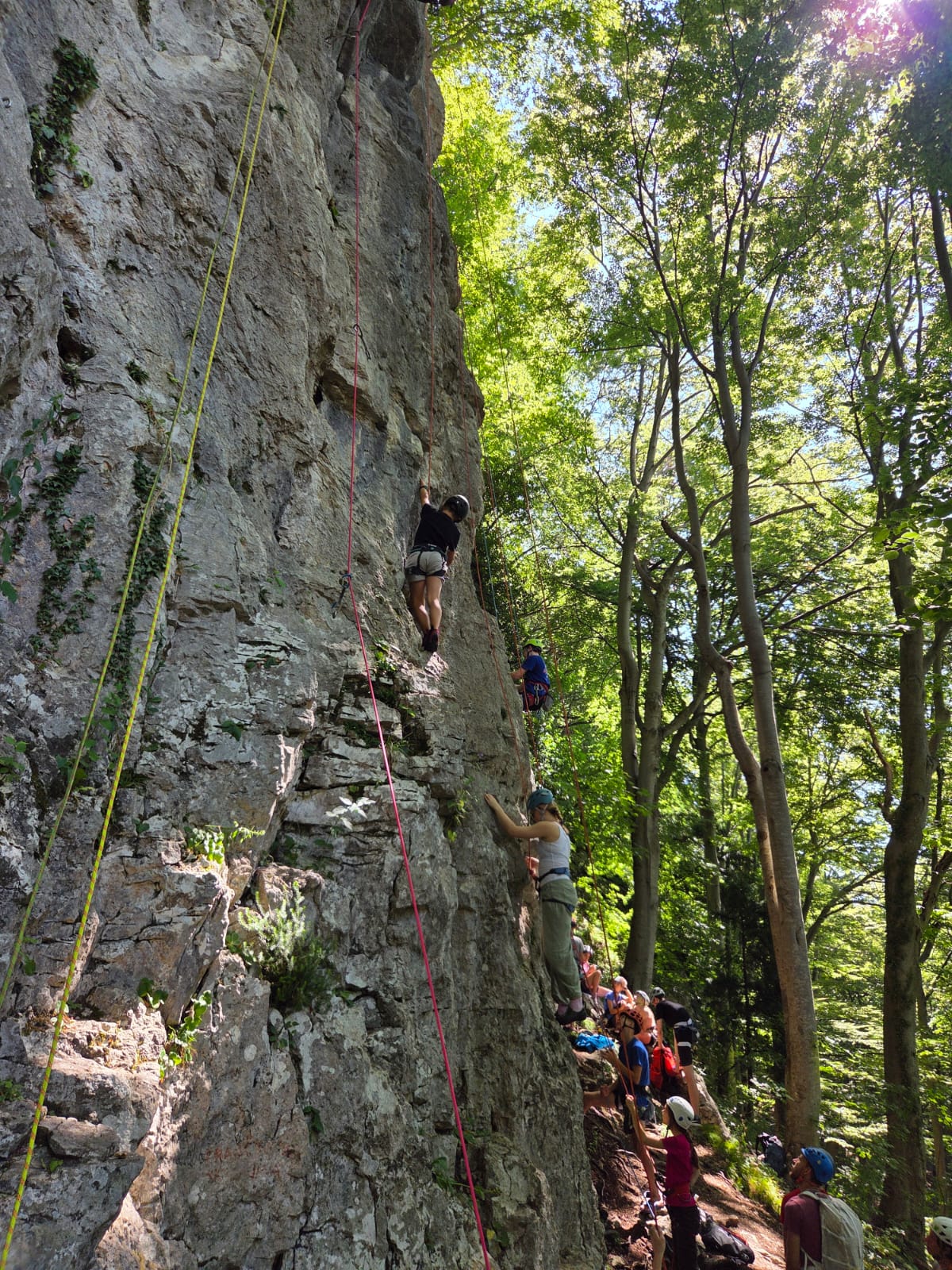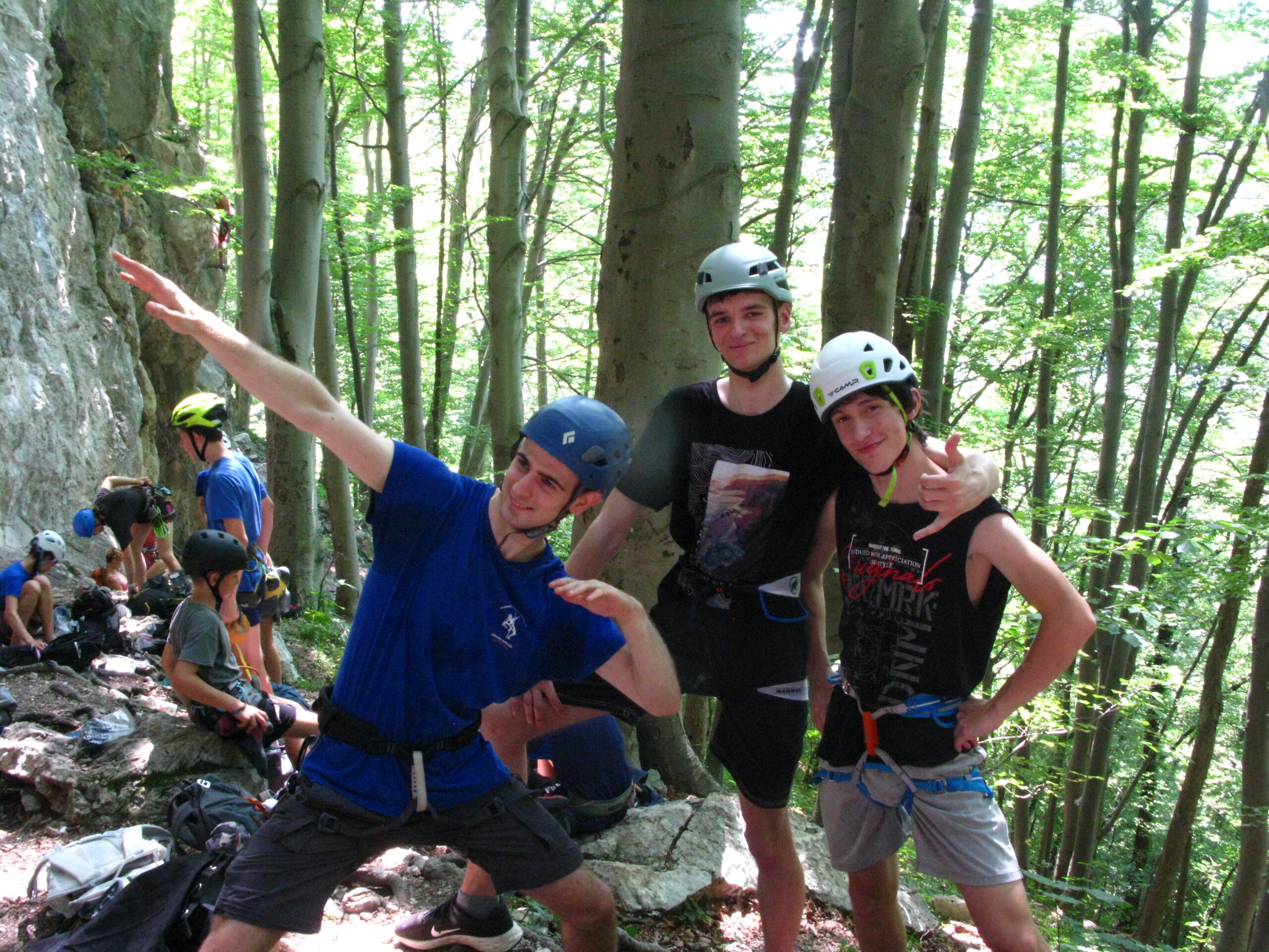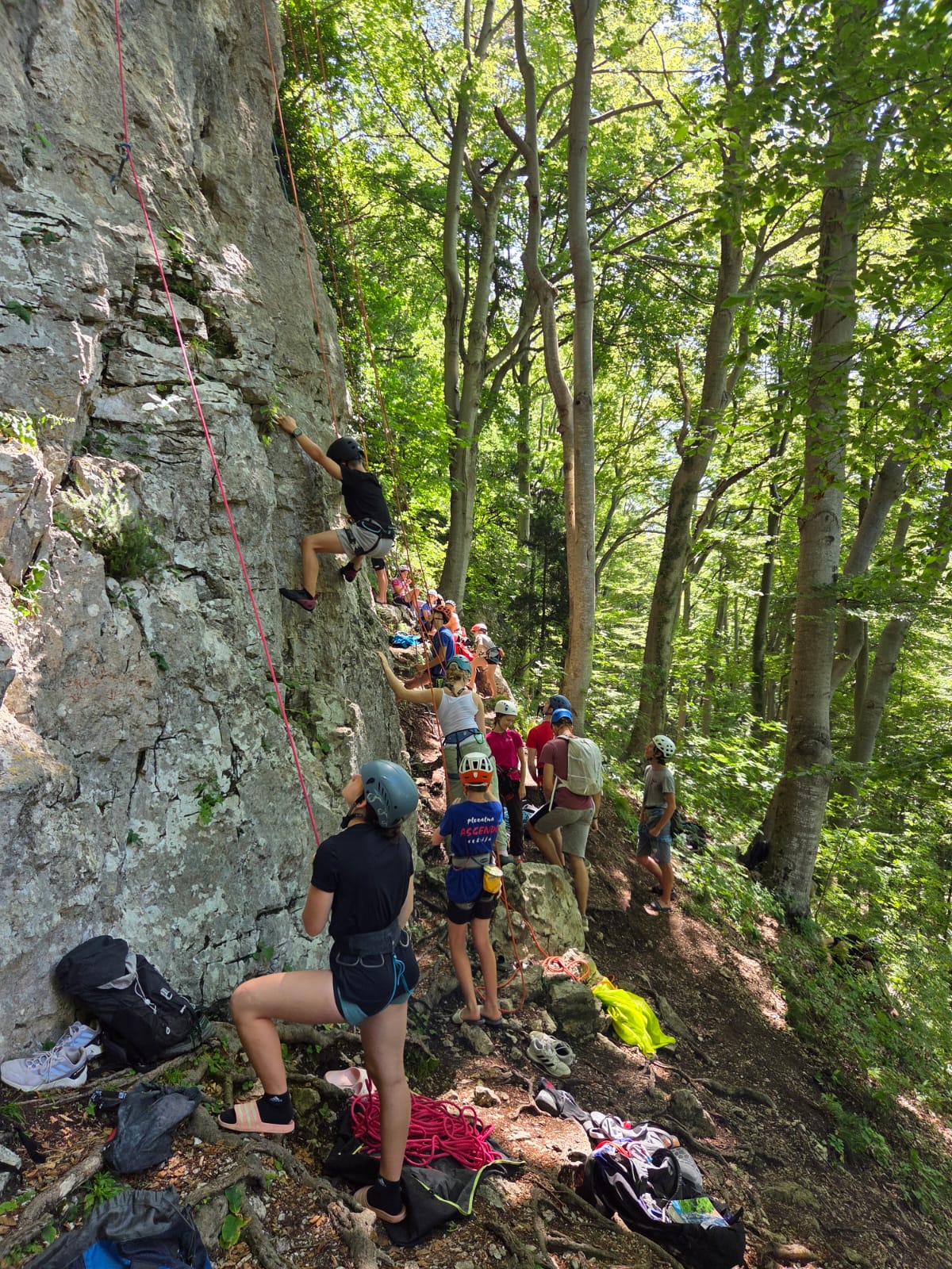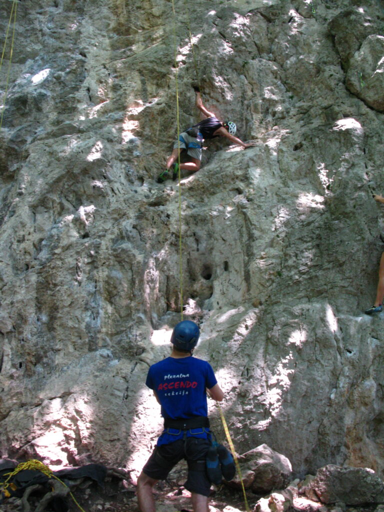 Tečajniki so ponovili manevre prevezovanja in izpenjanja kompletov ter preplezali veliko smeri v skali, pod bujnim očesom glavnega trenerja Simona. Za dodatek pa so videli tudi manevra vzpona in spusta po vrvi.