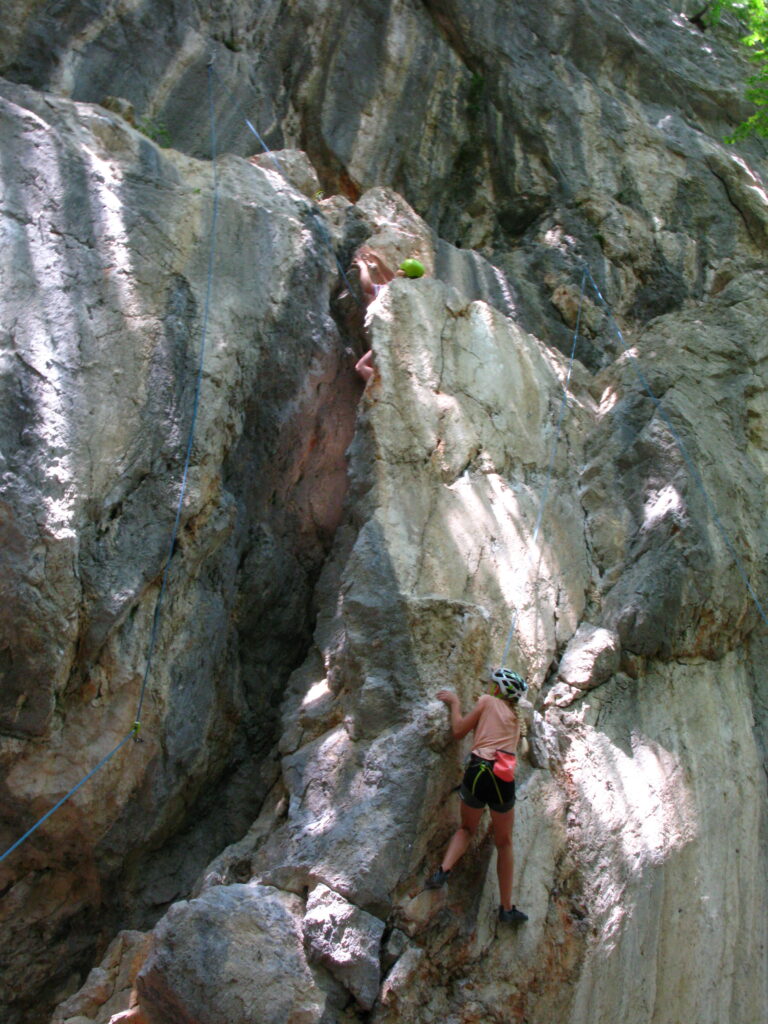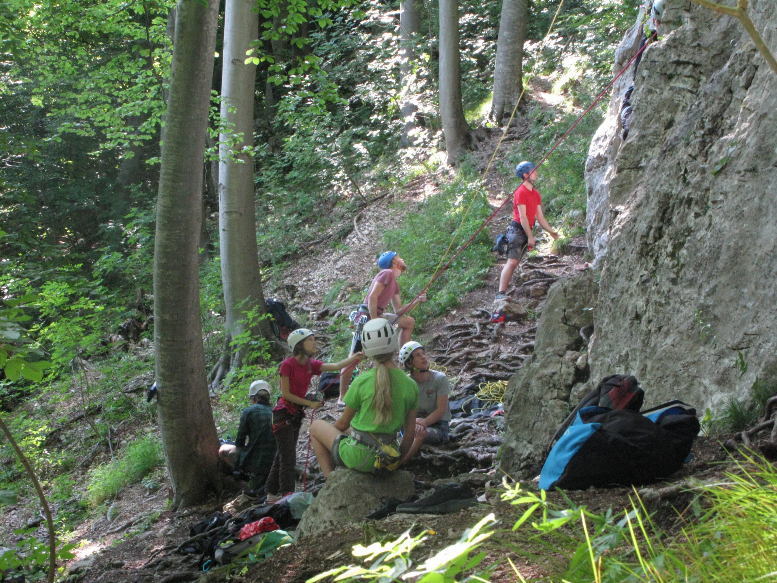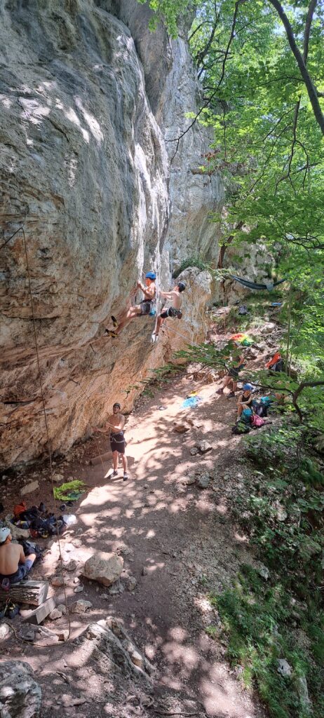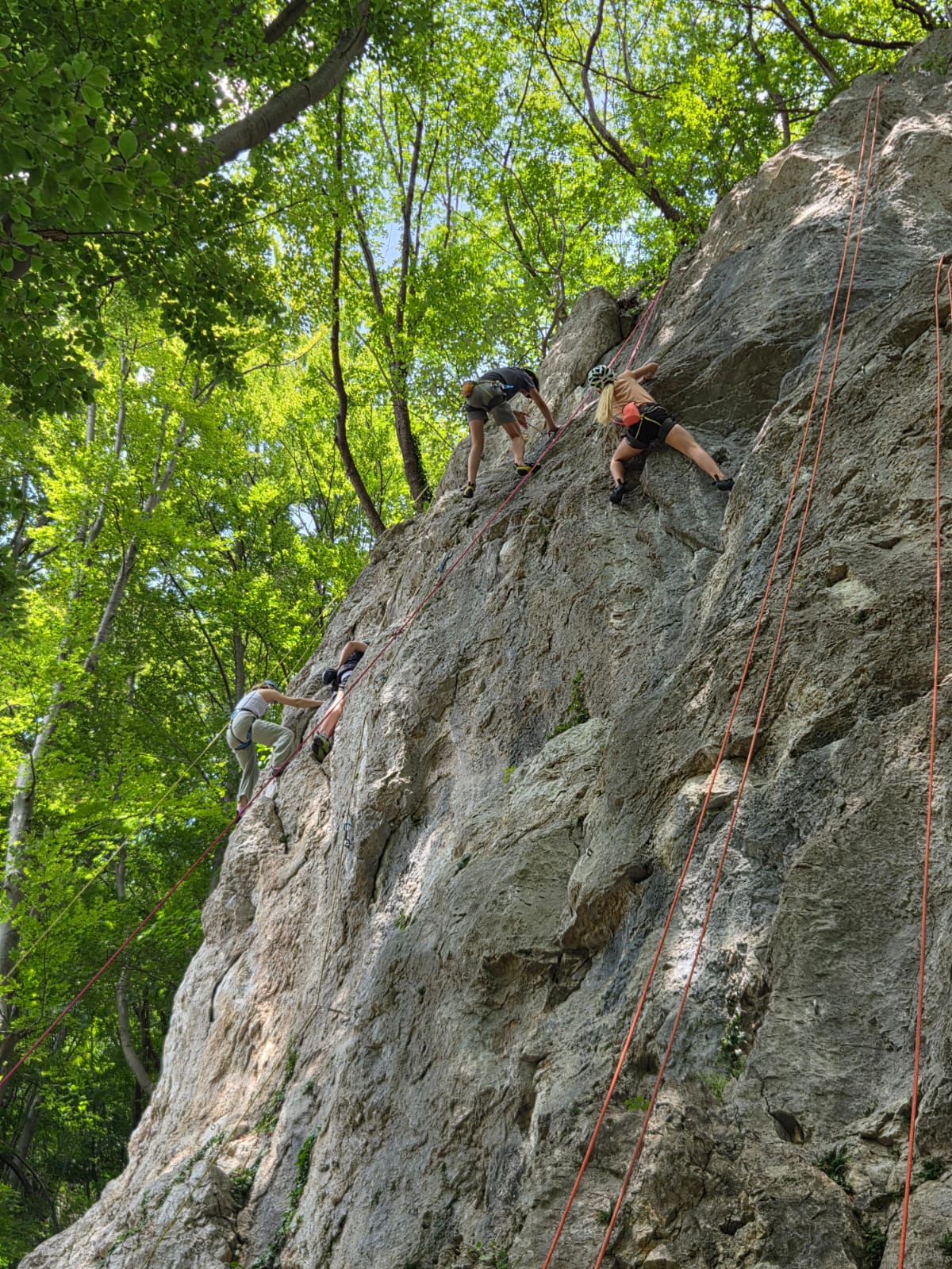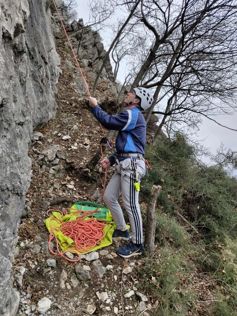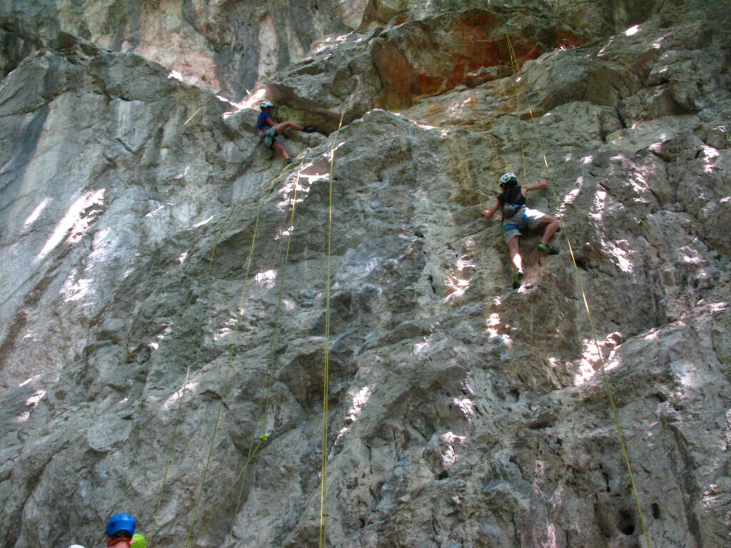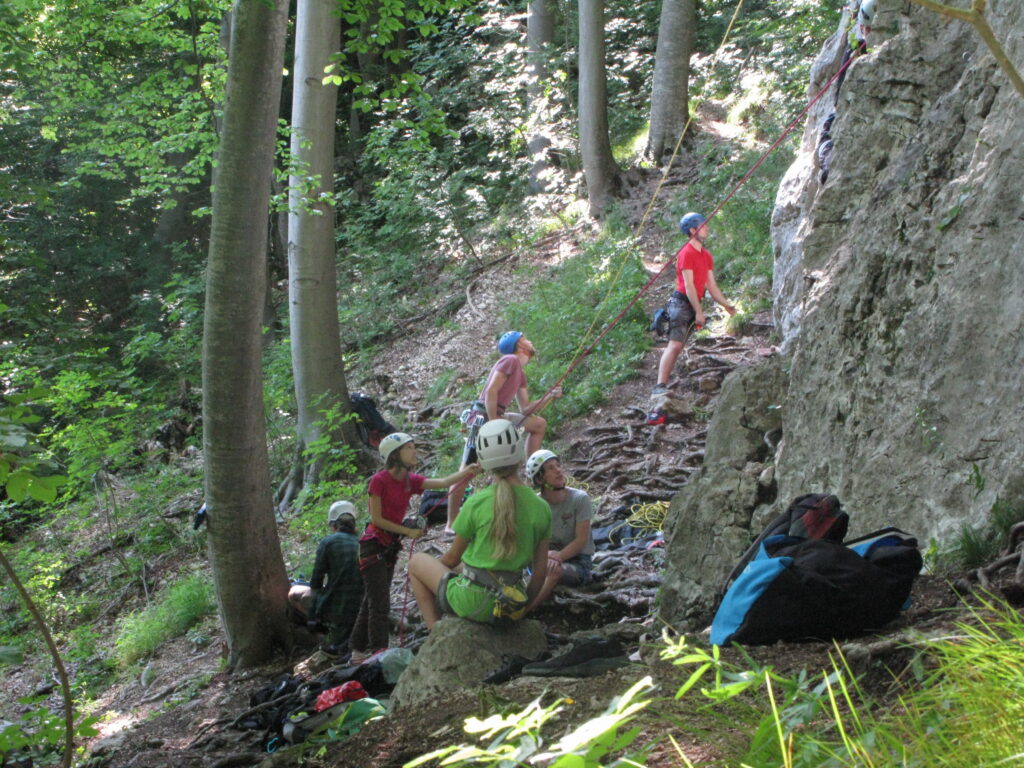 Tečajniki so ponovili manevre prevezovanja in izpenjanja kompletov ter preplezali veliko smeri v skali, pod bujnim očesom glavnega trenerja Simona. Za dodatek pa so videli tudi manevra vzpona in spusta po vrvi.