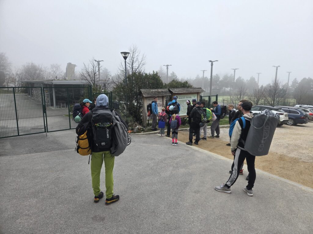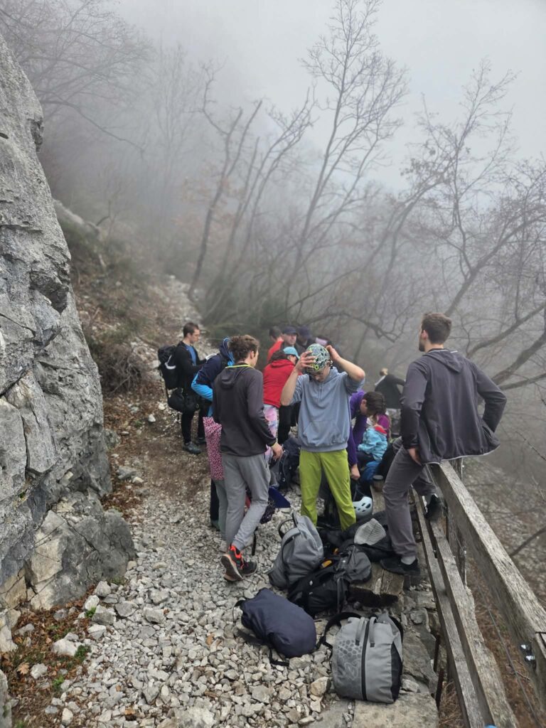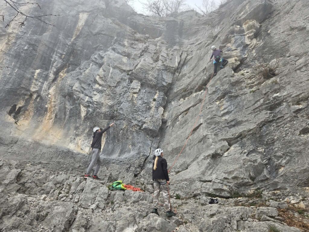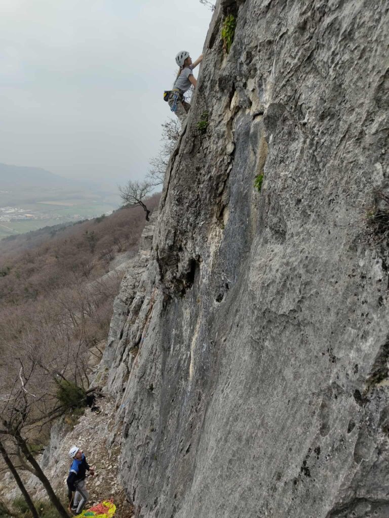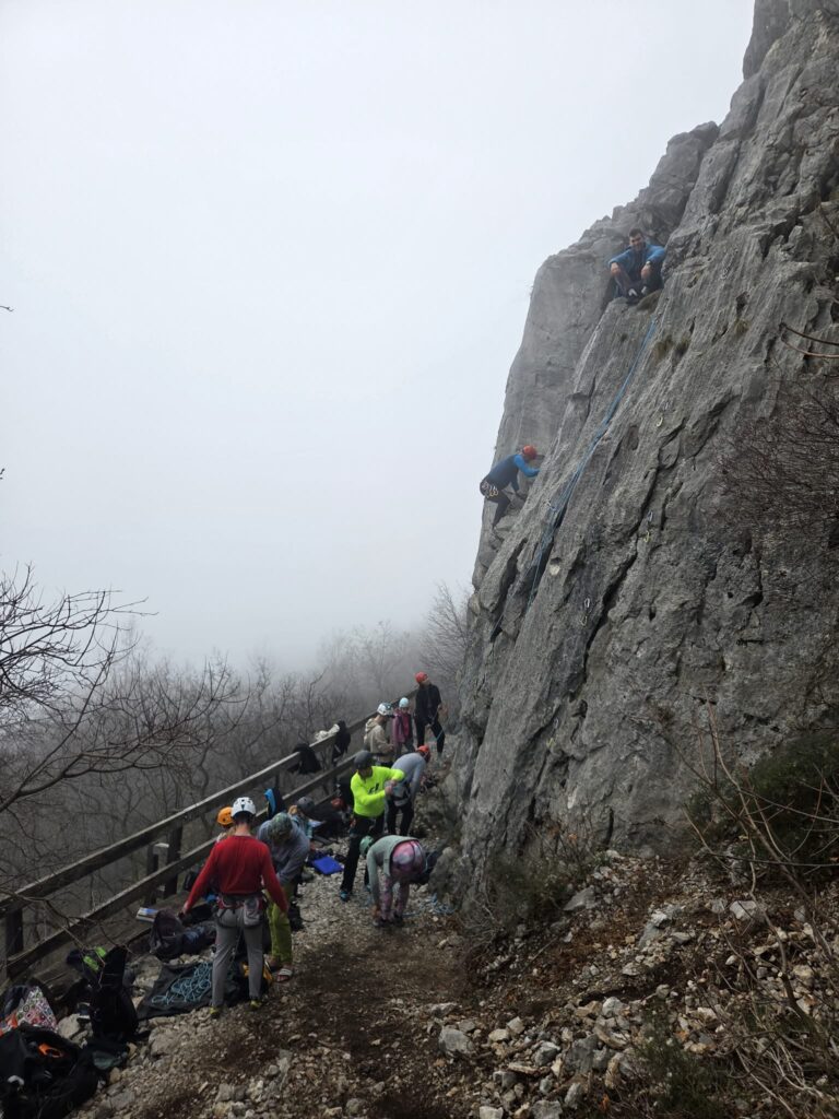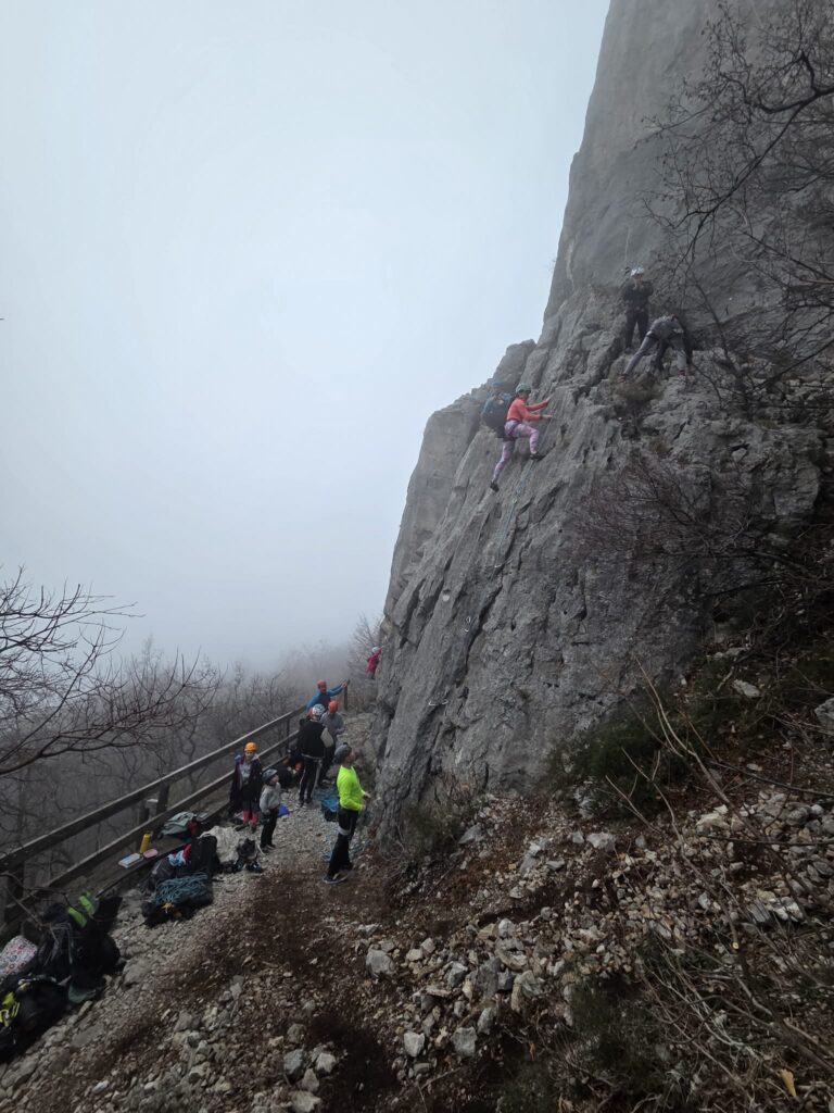 Ob zgodnjih jutranjih urah s nas je iz Grosuplja odpravilo 6 spremljevalcev in tečajniki z družinami. Meglena primorska pa nas dolgo ni spustila iz svojega pokrova – plezali smo v mrzlem in čakali, da se prikaže sonce in nas pogreje. Ob pol 13ih je to res prišlo v svoji polni moči in nam hkrati odprlo pogled na dolino, ki se je iz vrha smeri razprostirala pod nami.