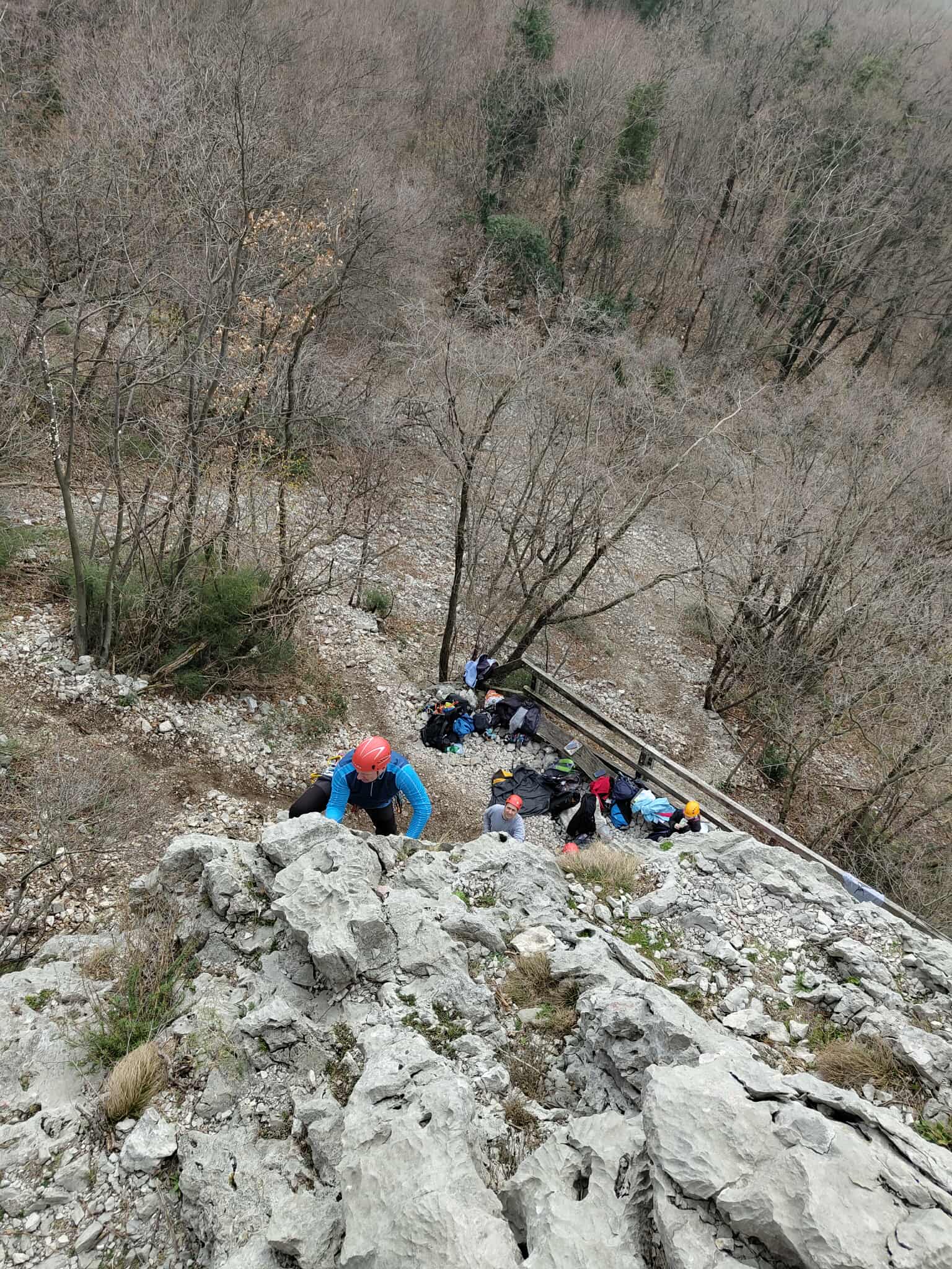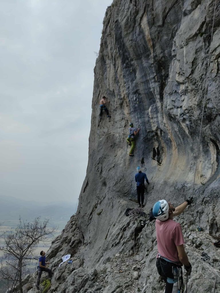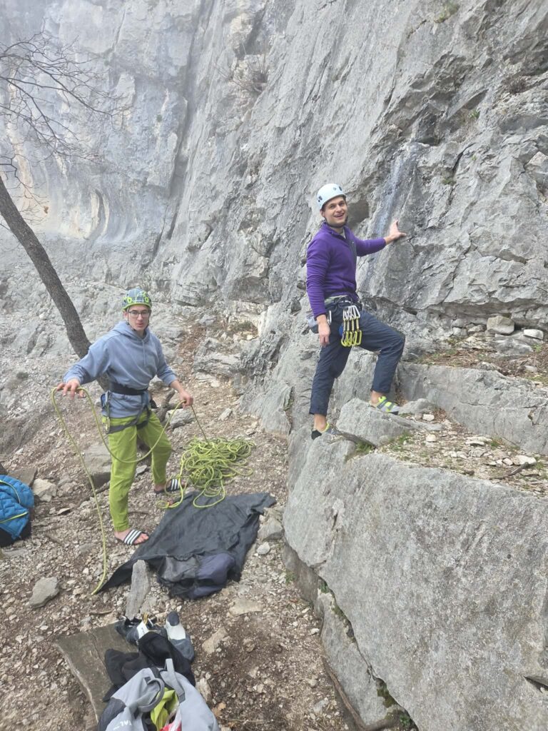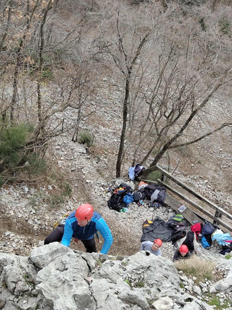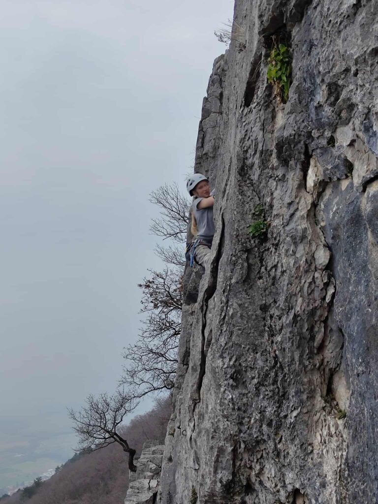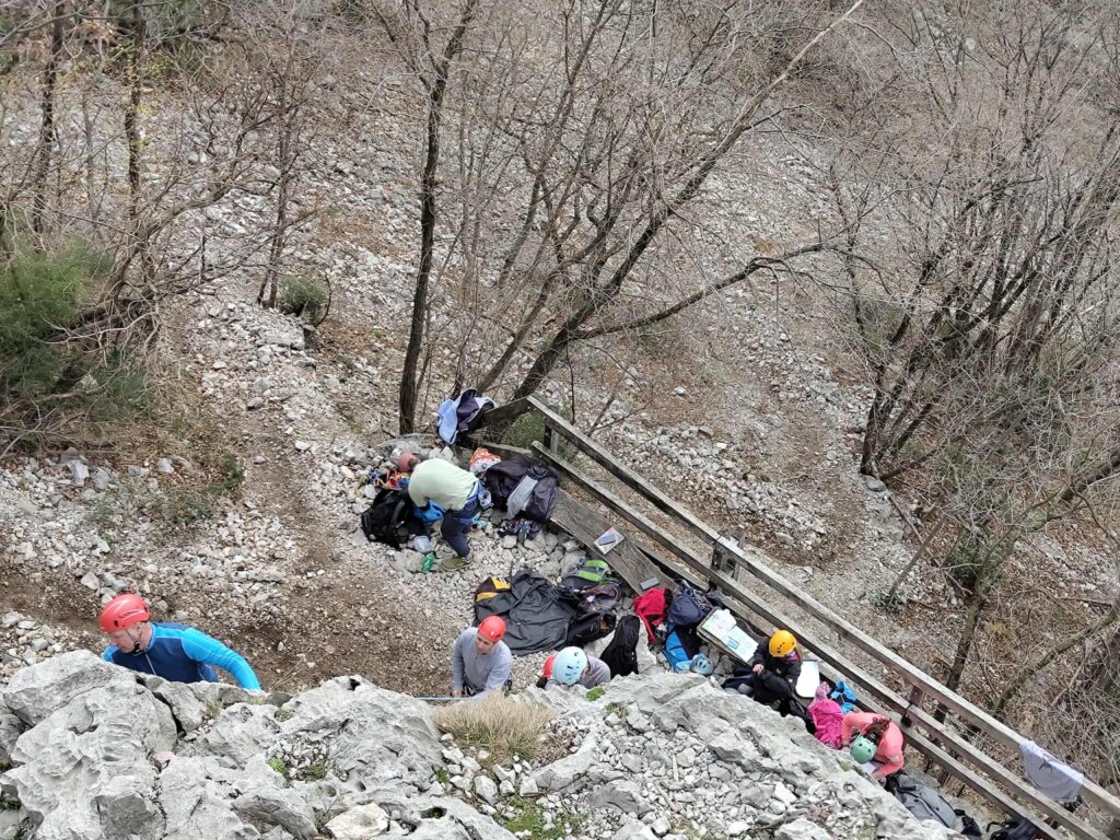 Ob zgodnjih jutranjih urah s nas je iz Grosuplja odpravilo 6 spremljevalcev in tečajniki z družinami. Meglena primorska pa nas dolgo ni spustila iz svojega pokrova – plezali smo v mrzlem in čakali, da se prikaže sonce in nas pogreje. Ob pol 13ih je to res prišlo v svoji polni moči in nam hkrati odprlo pogled na dolino, ki se je iz vrha smeri razprostirala pod nami.