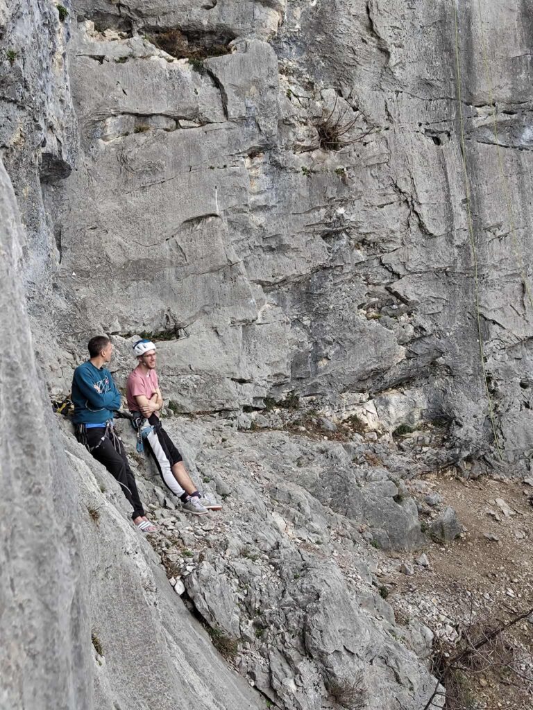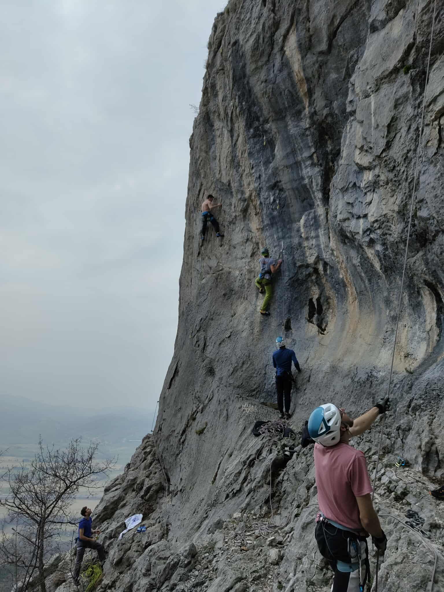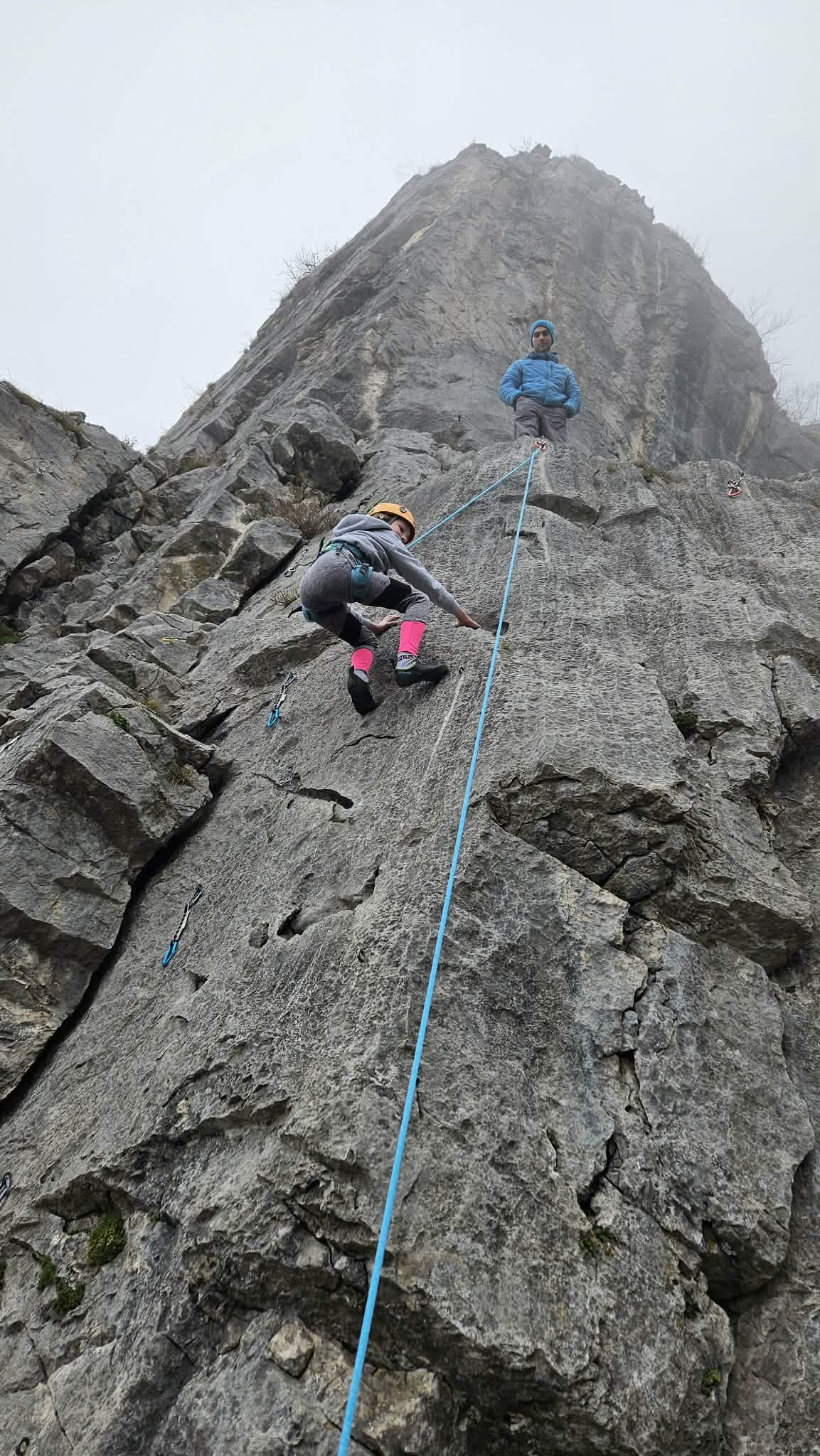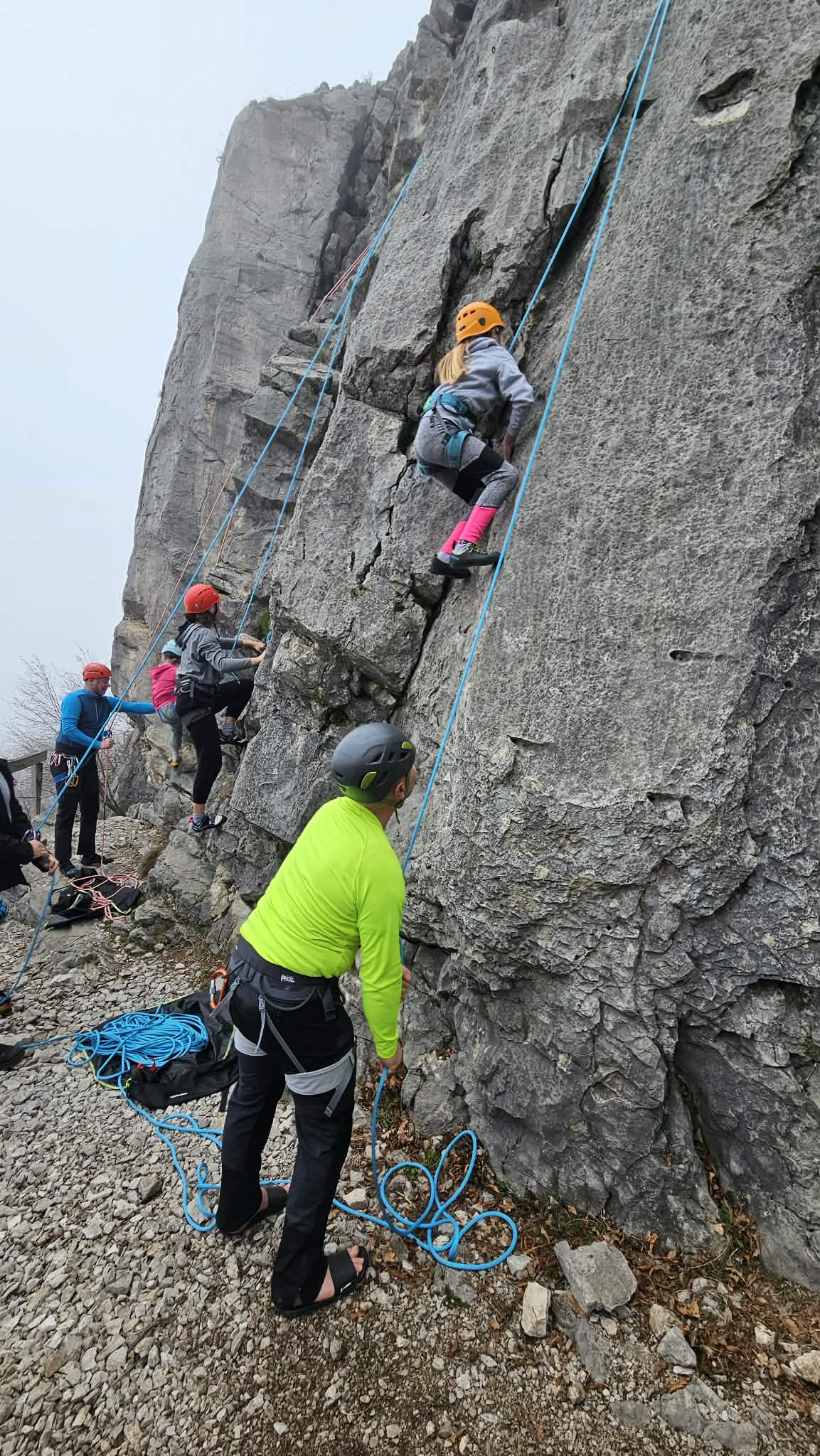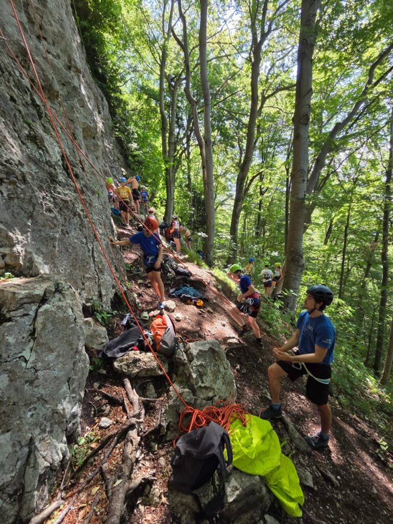 Ob zgodnjih jutranjih urah s nas je iz Grosuplja odpravilo 6 spremljevalcev in tečajniki z družinami. Meglena primorska pa nas dolgo ni spustila iz svojega pokrova – plezali smo v mrzlem in čakali, da se prikaže sonce in nas pogreje. Ob pol 13ih je to res prišlo v svoji polni moči in nam hkrati odprlo pogled na dolino, ki se je iz vrha smeri razprostirala pod nami.